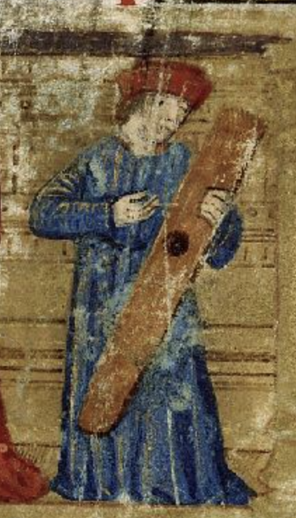 The tabor was usually a dainty little drum, as anyone glancing at medieval illustrations like the Luttrell Psalter (British Library Add MS 42130, c. 1325–1340, f. 23v) or various Books of Hours can see. But don’t get too comfortable, there was plenty of variety in what counted as a drum, both in type and size.
