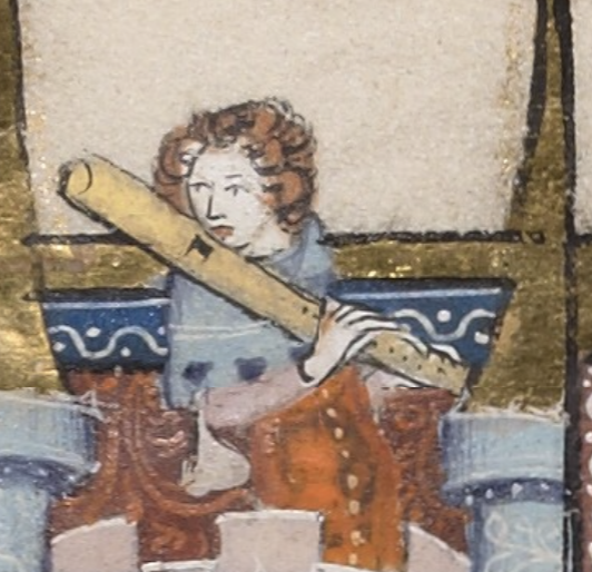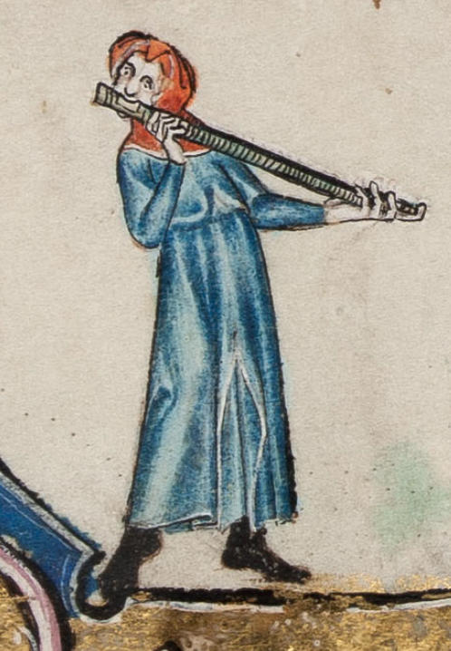 No medieval transverse flutes made it out of history’s mosh pit intact, leaving us squinting at iconography, scribbled accounts, and comparisons with their later Renaissance cousins. They were probably simple, cylindrical beasts of wood or bone, carved from a single piece. Iconography suggests variations in design, including embouchure holes located either centrally or towards one end of the flute, finger holes anywhere from nada to eight. The absence of thumb holes in medieval depictions suggests their construction might have differed from later designs. For example, the Manessische Liederhandschrift (early 14th century) shows flutes with varying embouchure positions, as seen in Der Kanzler (Cod. Pal. germ. 848, fol. 423v) and Meister Rumslant (fol. 413v). Both images also depict the flute being played alongside a vielle, hinting at their use in ensemble contexts.
