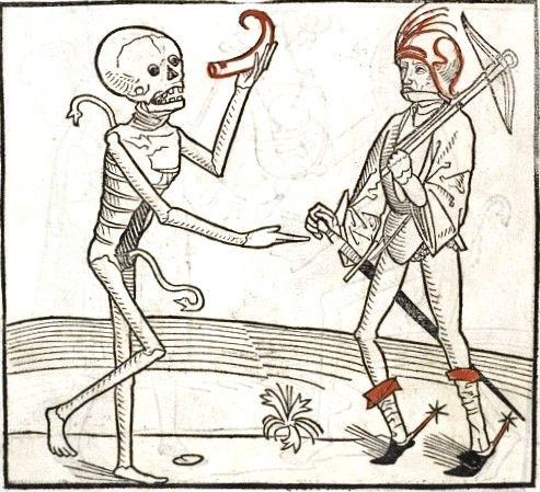 The gemshorn appears in a few iconographical specimens, notably in the woodcuts of the Heidelberger Totentanz (Dance of Death) from 1488. These woodcuts depict a personification of Death playing or holding various musical instruments, including the lute, bray harp, shawm, tromba marina, bagpipe, psaltery, and more. One woodcut clearly depicts a gemshorn with the window (the rectangular hole near the mouthpiece) visible, and this instrument is played at the wide end, as expected for a gemshorn. Although the illustration lacks finger-holes, this depiction places the earliest recorded date for the gemshorn at 1488. This illustration is unique in that it shows the gemshorn without finger-holes.
