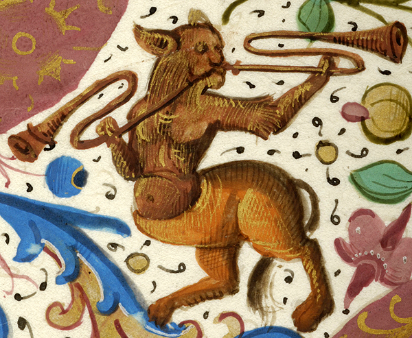 The Kaufmann Haggadah (1350-1360, Catalonia) materialises this exact crisis. On folio 34v, a hybrid piper appears with 'an animal's lower part and a man's upper body or head' (Falvy 1996: 239). The instrument, Falvy notes, 'has got no function here', it appears purely as boundary violation. Folio 55 presents a hybrid piper at the bottom of a framework illustration where 'the wind instrument, which is hard to define, seems to be too large against the proportions of the animal's body and human head' (Falvy 1996: 239). The disproportion itself becomes the point: these creatures actively distort the expected relationships between body, tool, and music-making capacity.